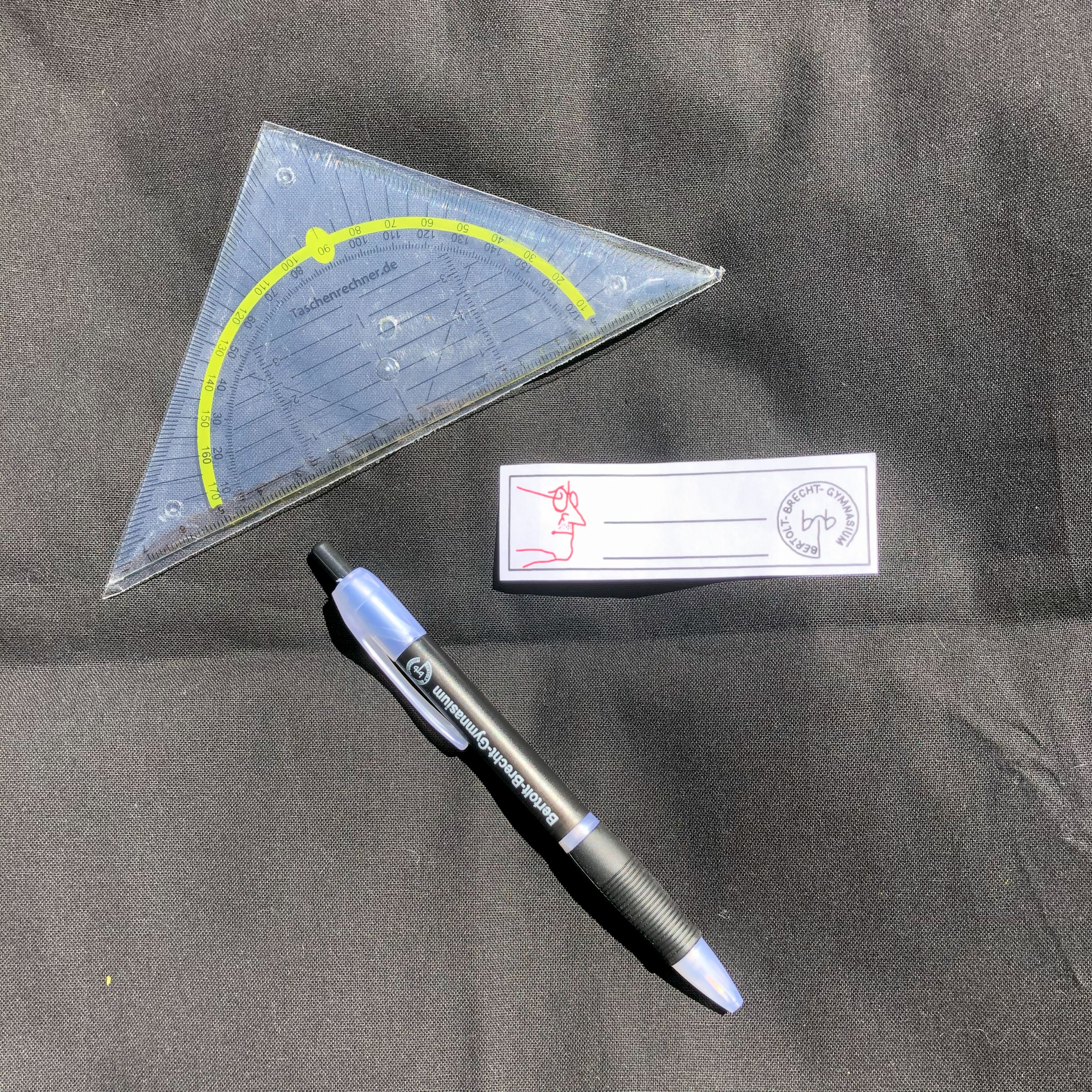 Geodreieck, Brecht-Kugelschreiber, Namensaufkleber |