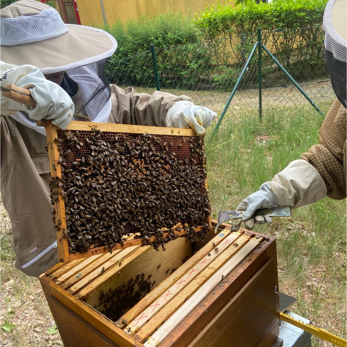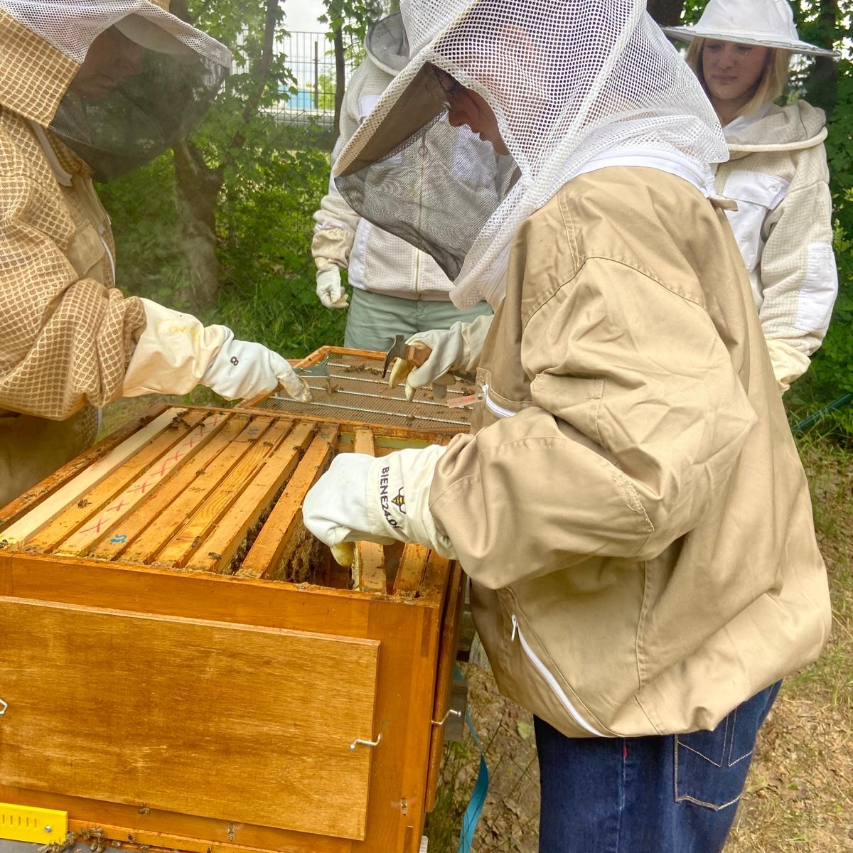 Hier können Sie Schüler und Schülerinnen aus unserem Seminarkurs sehen, die fleißig als Imker und Imkerinnen tätig sind.